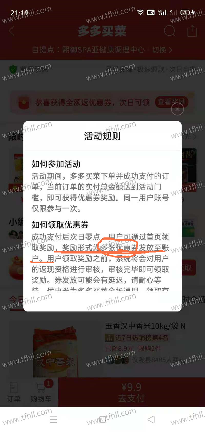 晚上的时候,我准备买点年货。打开拼多多,真的是各种促销、红包、兔单扑面而来。我就看到了一袋大米,10kg,才44.9元。我一看,哎,怎么便宜,才两块多一斤,而且就明天就可以提货。提货的地方就在我们街上。可以说是相当精准的打击了。而且更重要的是什么?上面有个下单返40元的图标一直在闪,而且还有个时间限制,好像是10分钟,造成很慌乱的感觉,你不买,机会就错过了。亏一个亿。我一想,天下还有这等好事,买一袋米44.9,还要返40元全额还,岂不5块钱买了20斤米?买,果断就下了单。