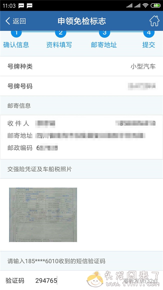 这个申请流程很简单,大家自行操作一下都能搞懂。最重要是一点,要提供一张交强险与车船税照片。其实,买保险时,车船税一般是代收的,和交强险在一张单子上面。所以,我只拍了一张交强险的保单,就提交了。